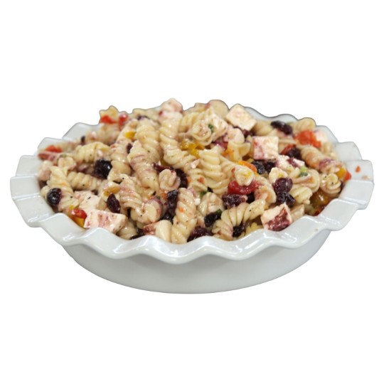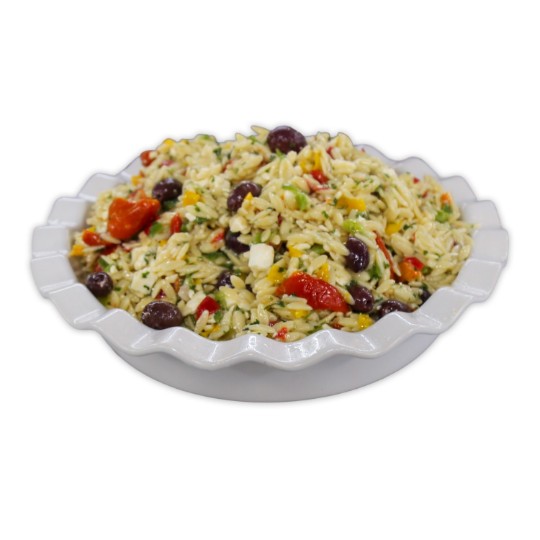 <p>A fresh and vibrant salad made with orzo pasta, green, red and yellow bell peppers, roasted tomatoes, onions, kalamata olives, feta cheese and a basil vinaigrette. Serving: 1lb.</p>